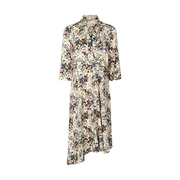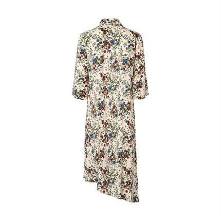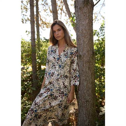 Albertine-kjolen er en midi-kjole med en løs pasform, V-udskæring og ærmer i albuelængde. Den asymmetriske kant skaber et let og feminint fald.