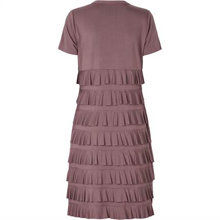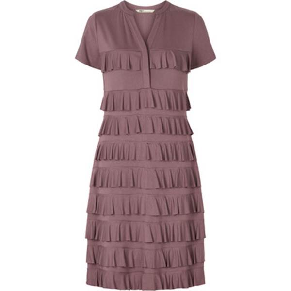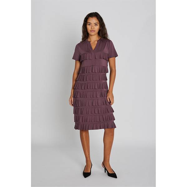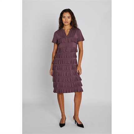 Jolaf-kjolen er en tætsiddende kjole med korte ærmer og en V-udskæring. Smukke flæsedetaljer, der strækker sig fra brystet til kjolens bund, fremhæver en flatterende pasform, der klæder alle kropstyper. Denne elegante kjole er ideel til både hverdagsbrug og festlige anledninger, og dens tidløse design gør den til en favorit i garderoben i mange år fremover.