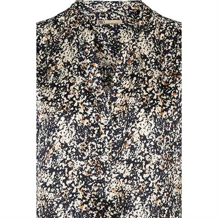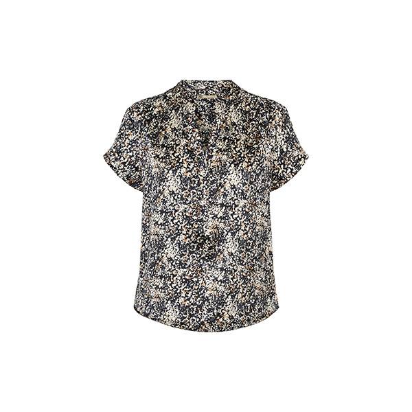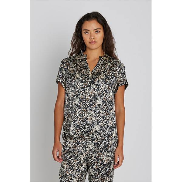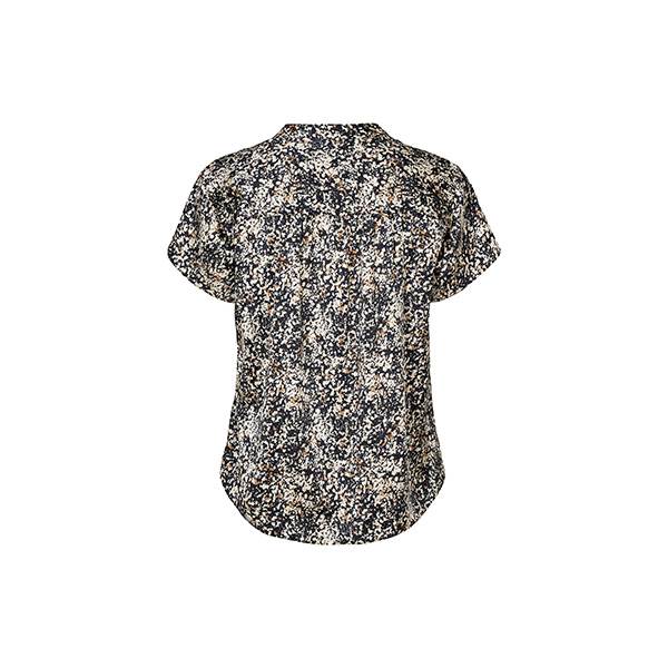 Kila er en kortærmet bluse med V-udskæring og knaplukning, fremstillet i en eksklusiv, printet kvalitet, der kombinerer mørke og lyse nuancer. Den afslappede pasform og det let draperede fald skaber et elegant og moderne udtryk.
