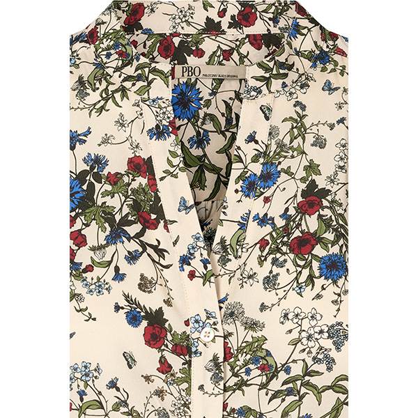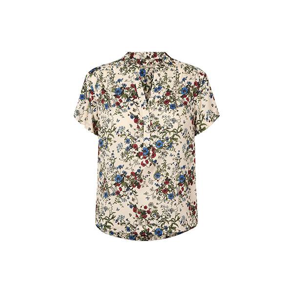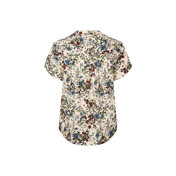 Kila er en kortærmet bluse med V-udskæring og knaplukning, fremstillet i en eksklusiv, printet kvalitet, der kombinerer mørke og lyse nuancer. Den afslappede pasform og det let draperede fald skaber et elegant og moderne udtryk.