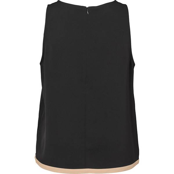 Lykke er en ærmeløs top med en løs pasform, rund halsudskæring og kontrastkant forneden, som tilfører designet et diskret sporty udtryk. Modellen kan styles med klassiske sorte bukser for et afslappet og luksuriøst look eller kombineres med jeans og sneakers for et moderne hverdagsudtryk.