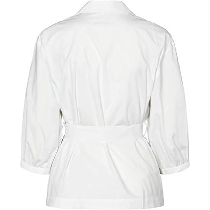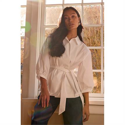 Mara-blusen med et elegant slå-om-design med klassisk skjortekrave og 3/4-lange ærmer. Rynkede detaljer ved skuldre og manchetter tilfører volumen samt et blødt og raffineret fald.