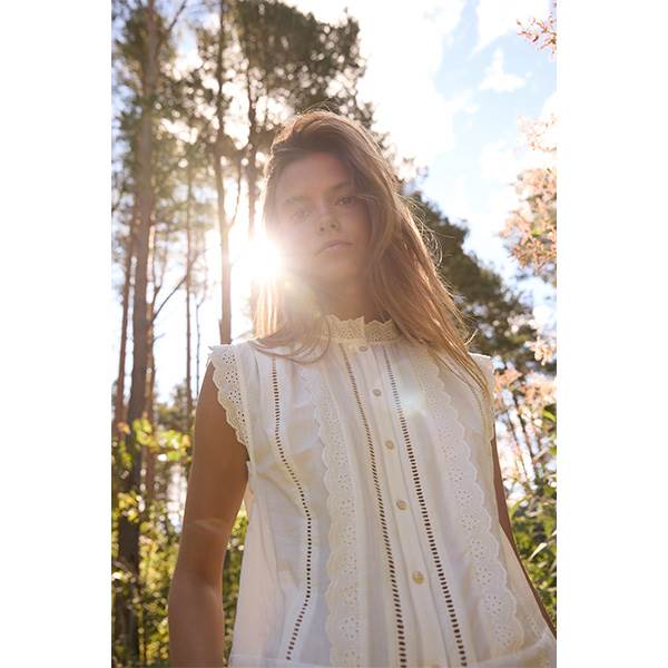 Novelle-toppen forener en feminin silhuet med let struktur og raffinerede detaljer. Den er designet til at skabe et sofistikeret sommerudtryk.