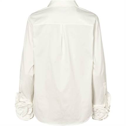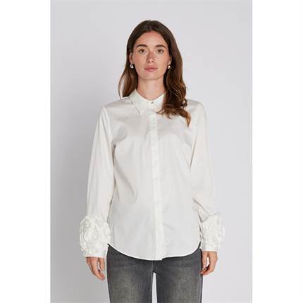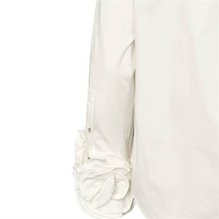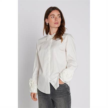 Rosa-skjorten har en klassisk, lige pasform med skjult knaplukning, spids krave og lange ærmer. De dekorative rosetdetaljer ved manchetterne tilfører et feminint og kunstnerisk præg.