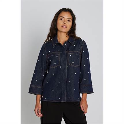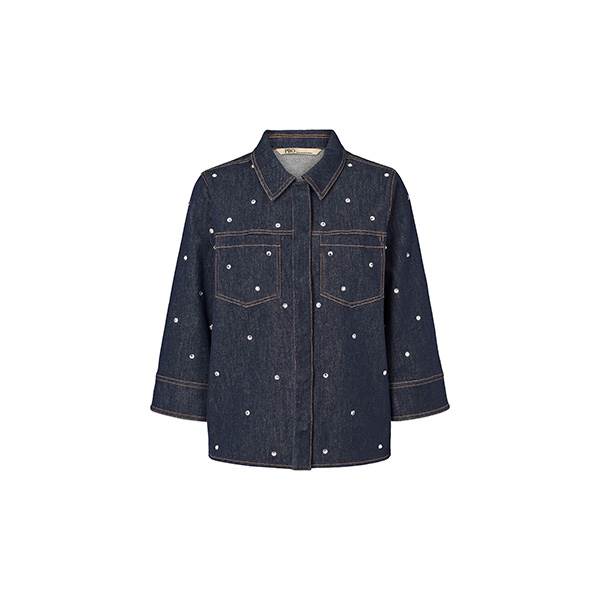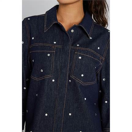 Shine-denimskjorten er udført i en let denimkvalitet med en afslappet pasform, klassisk krave og dekorative sten, som tilfører designet et feminint og moderne udtryk.