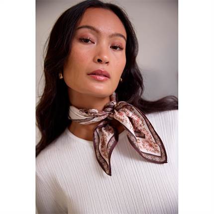 Tilfør dit look et strejf af elegance med PBO’s lille silketørklæde. Tørklædet er fremstillet i 100 % silke og prydet med et eksklusivt print i klassiske beige nuancer. Den glatte, let skinnende overflade giver et smukt og luksuriøst fald, mens den alsidige størrelse gør det velegnet til at bære om halsen, i håret eller bundet på en taske.