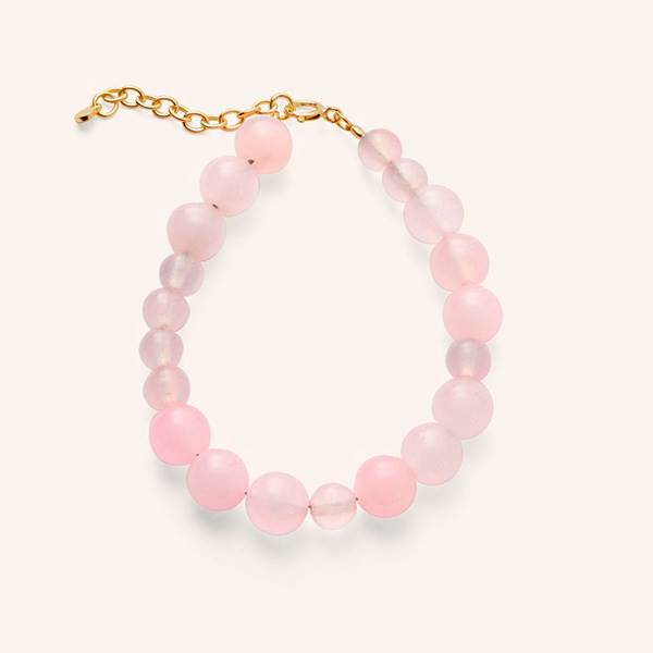 Blush Bracelet er et feminint armbånd, inspireret af rosens delikate farveskala – fra svagt, næsten transparent til klar rosa. Den smukke variation i stenene både i farve og størrelse skaber et naturligt og organisk udtryk, hvilket gør hvert armbånd helt unikt.