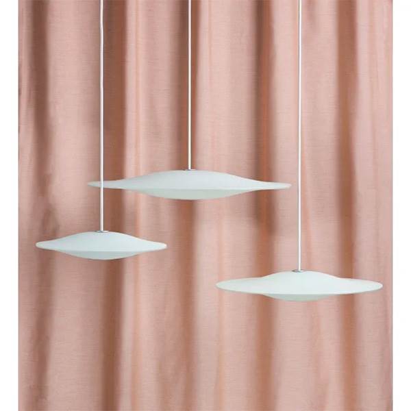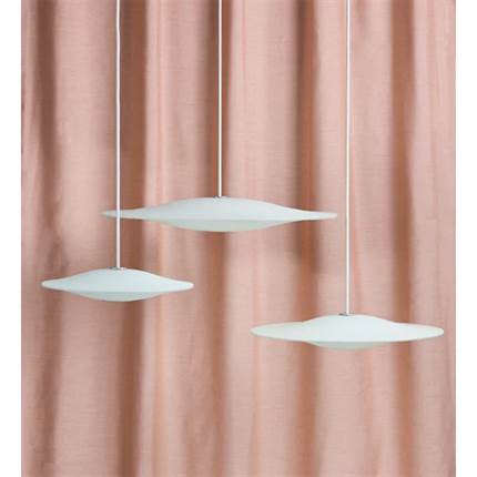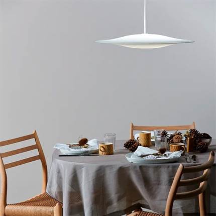Sinus er fremstillet i matteret, hvidt opalglas. Lampen sikrer optimale lysforhold, samtidig med at skærmen fremstår som en svævende, skulpturel form i rummet.