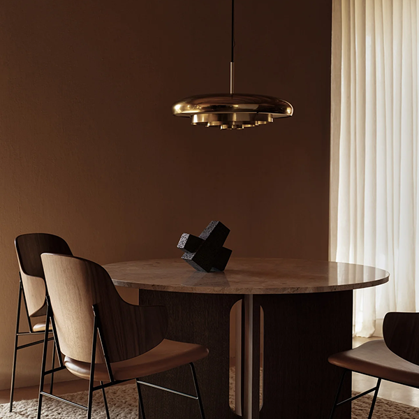 Med sin skulpturelle form og sin varme messingfinish tilfører lampen en eksklusiv og sofistikeret atmosfære til ethvert rum. Overfladen reflekterer lyset på en måde, der skaber et subtilt visuelt spil mellem lys og lyd – deraf navnet Resonant. Det gør lampen både dekorativ og funktionel, og dens rolige, elegante karakter gør den oplagt over spisebordet, i køkkenet over en køkkenø eller i et læsehjørne.