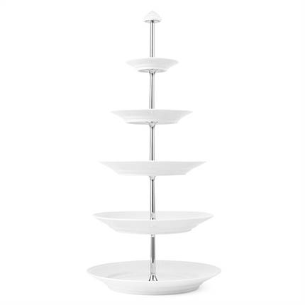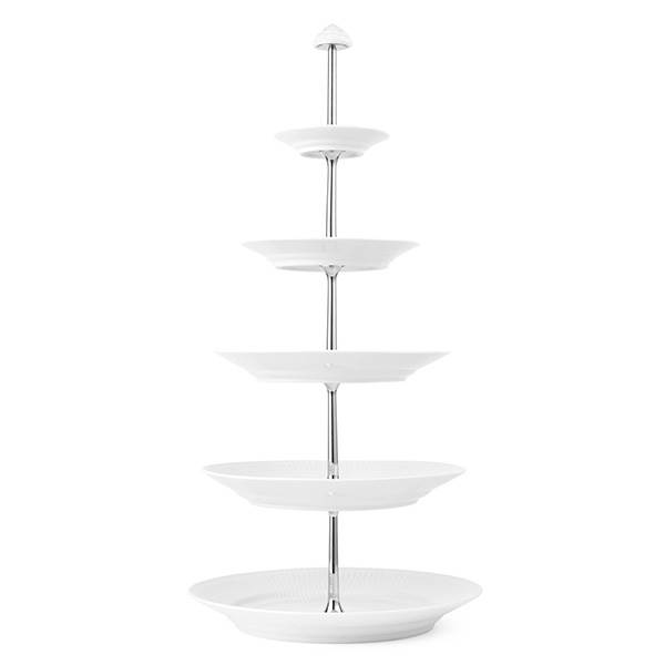 Den enkle femlags étagère i Hvid Riflet vil uden tvivl tiltrække opmærksomhed ved dessertbordet, til eftermiddagste, eller ved enhver anden sød anledning. Denne smukke étagère er udsmykket med Royal Copenhagens klassiske, håndlavede rifler, som fremhæver porcelænets rene, hvide overflade.