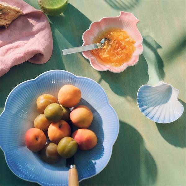 Skålen er udformet som en musling og prydet med en spraymalet blå kant, hvilket giver den et raffineret og poetisk udtryk. Den elegante form og det afdæmpede farvespil fremhæver porcelænets struktur og gør skålen velegnet til mindre serveringer samt som et dekorativt element i dagligdagen. Samtlige dele i Iris-kollektionen er håndsprøjtemalede, hvilket indebærer, at hvert enkelt stykke porcelæn fremstår unikt.