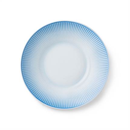 Den dybe Iris-tallerken er udført med en spraymalet blå glasur, som blidt toner ud mod midten og fremhæver den riflede overflade. Tallerkenen er særligt velegnet til servering af supper, pastaretter eller farverige salater og fremstår desuden særdeles æstetisk i kombination med øvrige dele af Iris-stellet, hvorved et personligt og farverigt udtryk opnås. Samtlige dele i Iris-kollektionen er håndsprøjtemalede, hvilket indebærer, at hvert enkelt stykke porcelæn er unikt.