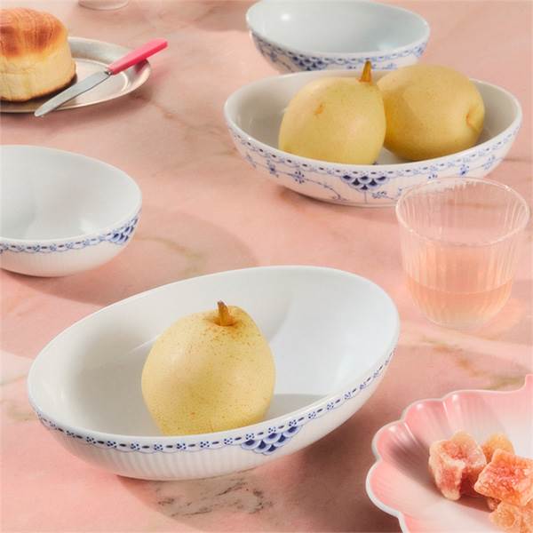 Den håndmalede blonde indrammer skålens taktile rifler, mens de klassiske fiskeskælsdekorationer understreger det raffinerede udtryk. Skålen kan med fordel kombineres med andre stel fra Royal Copenhagen for at skabe et unikt og personligt udtryk.