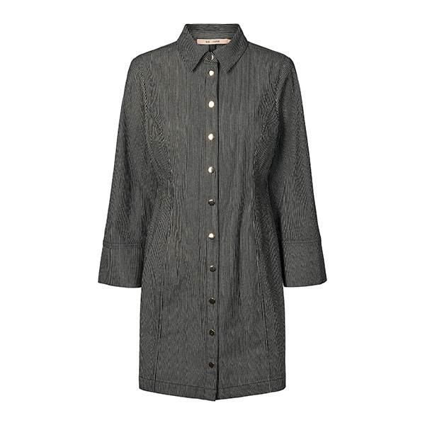 Astara er en kort kjole med lange, vide ærmer og en markeret talje, der elegant fremhæver silhuetten. De klassiske striber kombineret med gyldne knapper tilfører kjolen et moderne og stilrent udtryk.