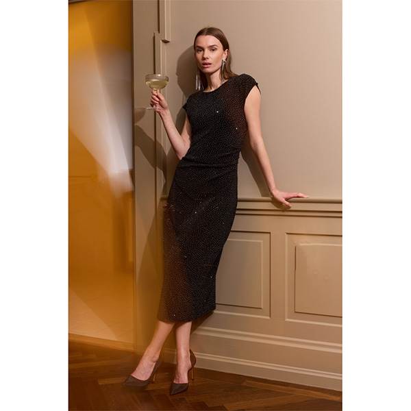 Kjolen Galentea er en festlig model med en slank silhuet samt dekorative draperede detaljer, der tilfører dybde og bevægelse. Designet fremhæver kroppens linjer og skaber et elegant og glamourøst udtryk.