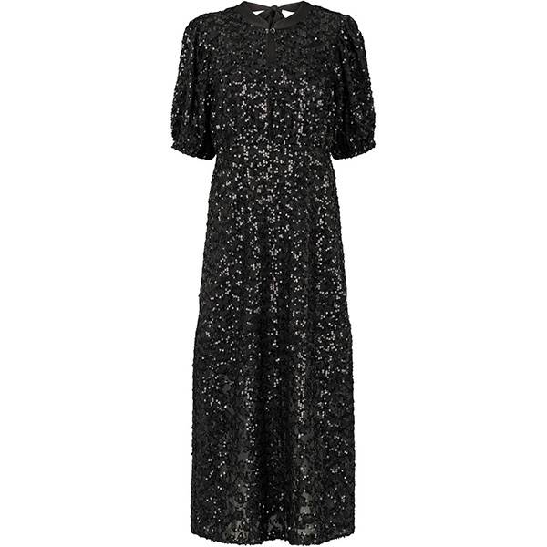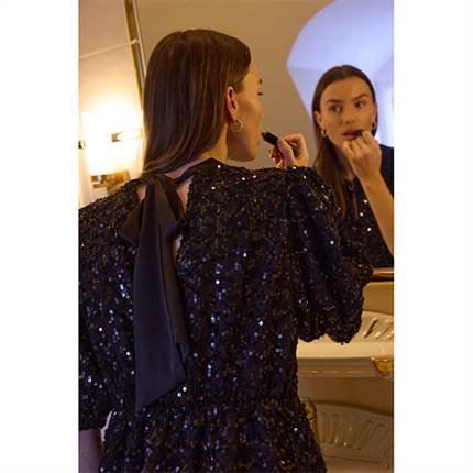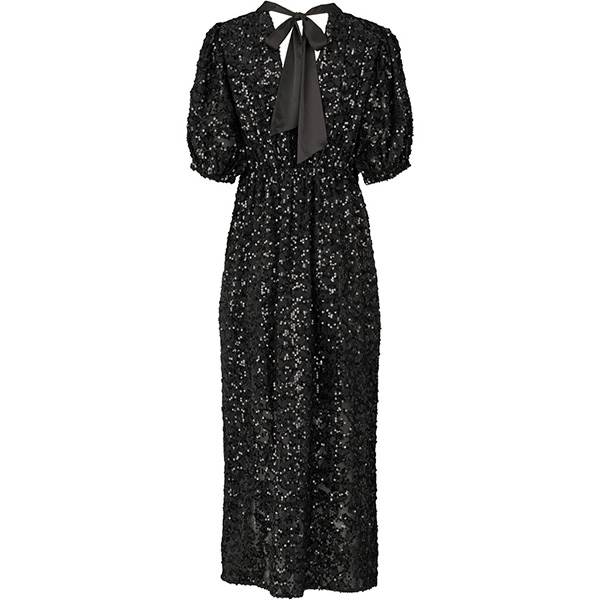 Demi er en lang festkjole med korte, voluminøse ærmer og en elegant, åben ryg med bindebånd. Elastiske detaljer ved ærmekanterne og i taljen skaber en smuk, feminin facon, der fremhæver silhuetten.