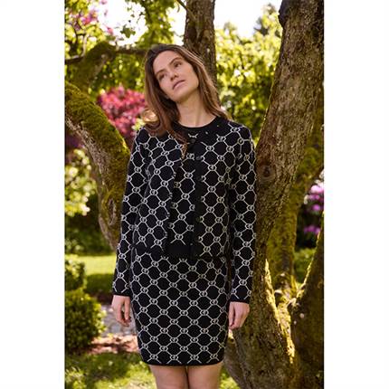 Cardiganen kan styles med den matchende nederdel for et helstøbt og harmonisk look eller bæres over en enkel kjole for et mere afslappet udtryk.