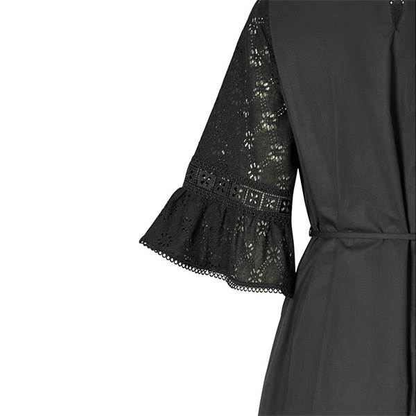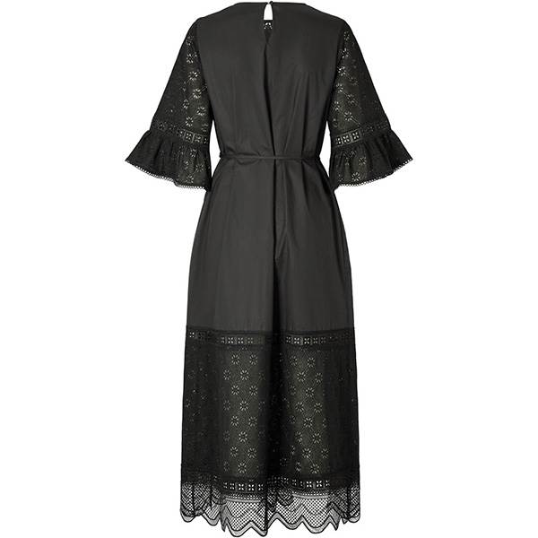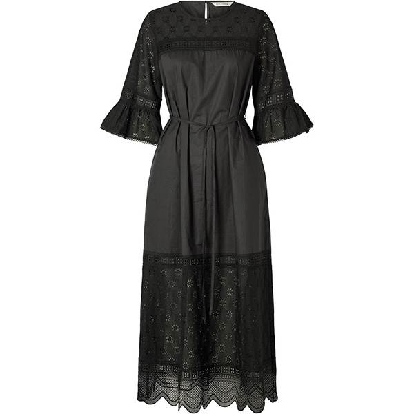 Randa er en elegant midikjole fremstillet i broderie anglaise med fine, dekorative detaljer og bindebånd i taljen. Designet forener struktur og lethed i et feminint og tidløst udtryk.