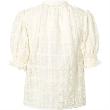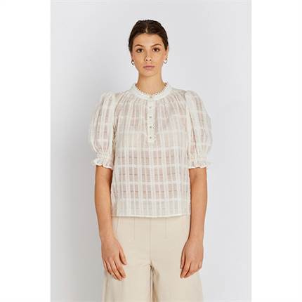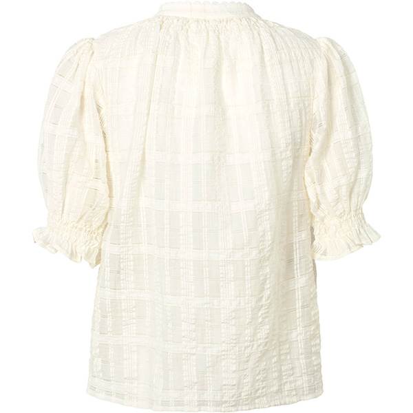Rowan-skjorte er en feminin skjorte, der kendetegnes ved korte pufærmer og fine, delikate detaljer. Den let strukturerede overflade kombineret med en lille ståkrave skaber et lyst og elegant udtryk med et strejf af vintage-charme.