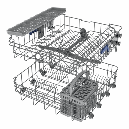 Maskinen rummer 3 kurve, hvoraf den øverste er justerbar med fuldt udtræk og lejer, hvilket giver fleksibilitet til at tilpasse pladsen til forskellige typer service. Den har indvendig belysning og en praktisk gulvlysindikator, der viser, når programmet er færdigt.