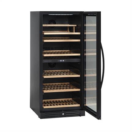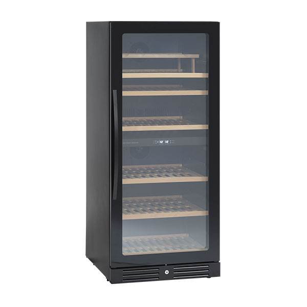 Skabet er udstyret med bøgetræshylder, rammeløs sort glasdør og lavt lyd- og vibrationsniveau, hvilket sikrer rolig opbevaring og et elegant udtryk – perfekt til både køkken og vinrum.