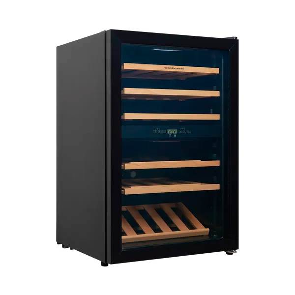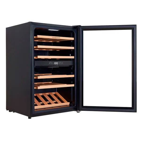 De bøgetræshylder og det digitale temperaturdisplay giver et eksklusivt look og præcis styring, mens den vendbare dør gør det nemt at tilpasse vinkøleren til dit køkken eller barområde.