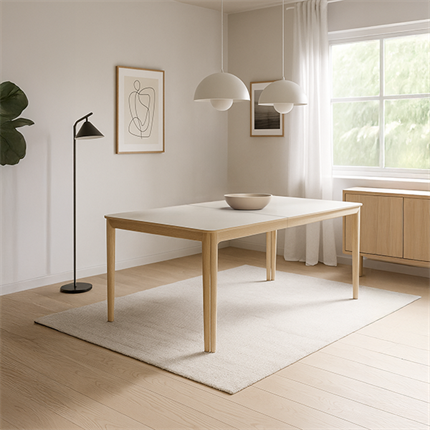 SM31 spisebord fra Skovby er et tidløst og funktionelt bord i hvidolieret eg med bordplade i varm grå højtrykslaminat. Bordet kombinerer klassisk dansk design med praktiske funktioner og holder i mange år. Med sit elegante og neutrale udtryk passer det ind i alle typer indretninger og skaber rammen om hyggelige måltider for familien. Bordet kan nemt udvides med tillægsplader, så der bliver plads til endnu flere gæster.