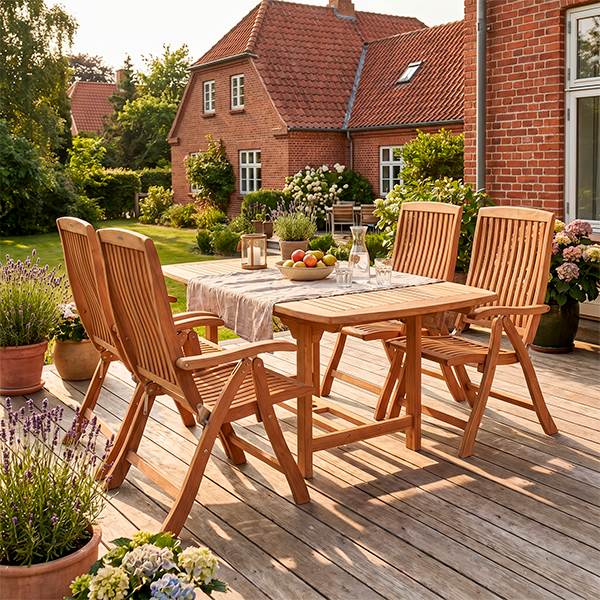 Havemøbelsættet er fremstillet i massivt teaktræ (Grade B), som er kendt for sin styrke og modstandsdygtighed over for det danske sommervejr. Dette teaktræ har en jævn gyldenbrun farve. Træet er langsomt dyrket på en plantage og man bruger kun kernestammen til at fremstille møblerne. Denne metode giver meget naturligt olie i træet og dermed en flot gylden farve. Teaktræ er et levende naturmateriale, der med tiden vil udvikle en grålig patina, hvis det ikke behandles. Dette giver møblerne et klassisk og naturligt udtryk.