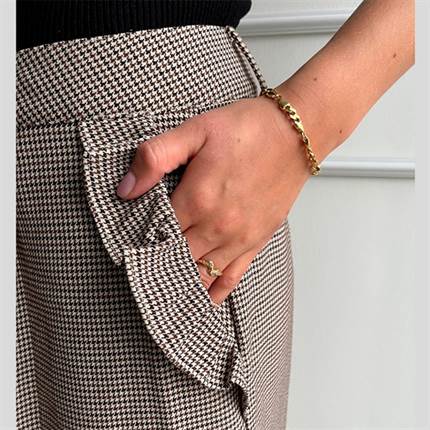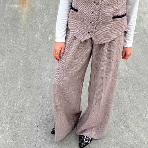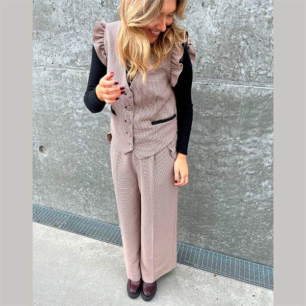 En stilfuld og komfortabel buks med brede ben og et elegant fald. Modellen er designet med klassisk linning, lynlås- og knaplukning samt bæltestropper, der giver mulighed for at tilføje bælte og skabe et personligt udtryk. De fine sidelommer er detaljeret med en diskret flæsekant, som tilfører et feminint præg til det klassiske ternede design. En alsidig buks, der egner sig både til hverdagsbrug og til festlige lejligheder.