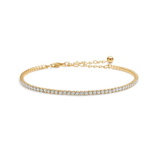 Mini Tennis Bracelet- Armbåndet er sammensat af et stort antal små zirkonia-sten og er konstrueret med diskrete, fleksible led, der giver en særlig blød og smidig pasform omkring håndleddet. Den høje kvalitet sikres gennem anvendelsen af ægte 925 sterlingsølv, forgyldt med 18 karat guld. Armbåndet kan bæres alene for et stilrent udtryk eller kombineres med øvrige smykker for at fuldende et harmonisk look.