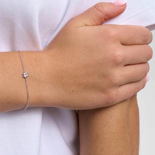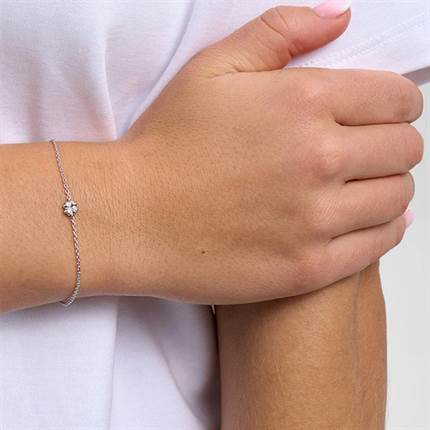 Den slanke, polerede kæde med fine, runde led ligger elegant omkring håndleddet, mens det lille firkløver har bløde, afrundede blade og en poleret glans, der diskret reflekterer lyset og følger dine bevægelser med rolige skær.