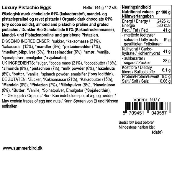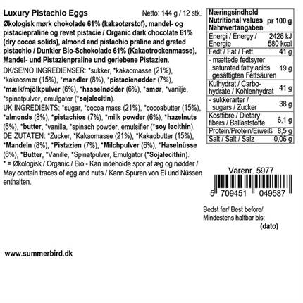 Forside › Isenkram › Påske Nyhed Summerbird Luxury Pistachio Eggs På lager 148,00 kr. Antal Læg i kurv Få et tilbud Gratis fragt over 499 kr. Prisgaranti 10.000 m2 bolighus Mængde 144g Varenr.: 64000442 Ean: 5709451049587 Smuk gaveæske fra Summerbrid Elegant og stilfuld gaveæske fra Summerbird. Gaveæsken indeholder mørk chokolade Amazonas 61%, mandel og pistacie-praliné og revet pistacie. Har du brug for hjælp? Kontakt vores kundeservice på: 98 93 61 55kundeservice@ecmh.dk Køb mere - Spar mere Skal du handle stort ind? Så send os en uforpligtet forespørgsel Udfyld formular