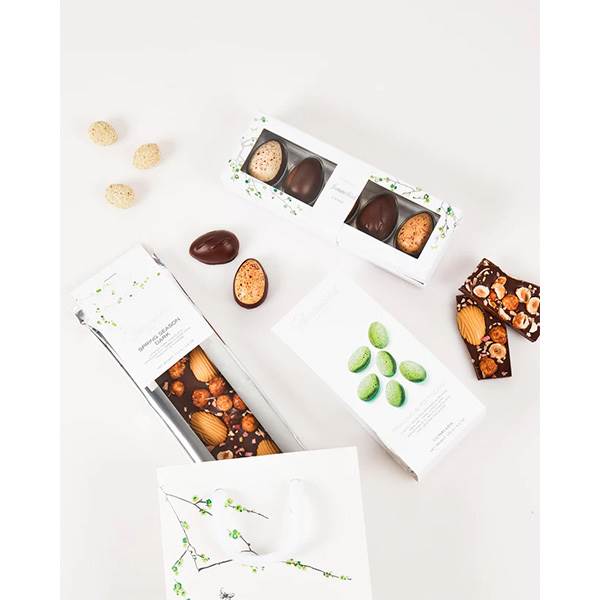 - Praliné & Pistachio-mandler - Let ristede spanske mandler, praliné, mørk chokolade Amazonas 61%, hvid chokolade og revet pistacie.