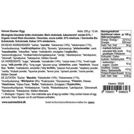 En eksklusiv påskeæske med fire unikke varianter af Summerbirds dragerede Velvet Eggs. Æsken indeholder varianterne Amber Caramel, Dark Praliné, Spring Liquorice samt nyheden Pistachio Velvet Eggs. En udsøgt sammensætning af påskeæg til dem, der værdsætter håndværk af høj kvalitet, førsteklasses råvarer og gastronomisk finesse.