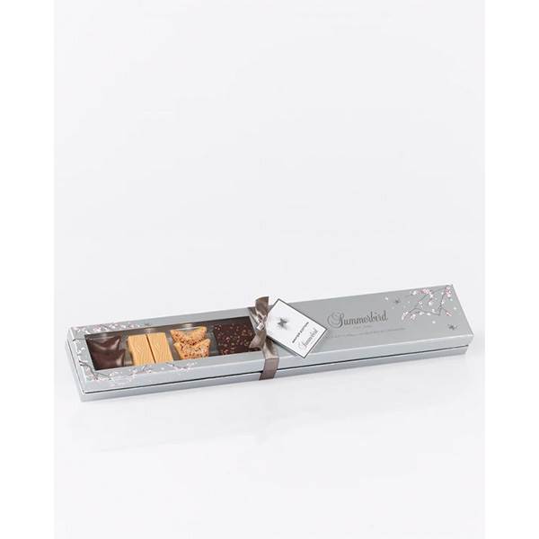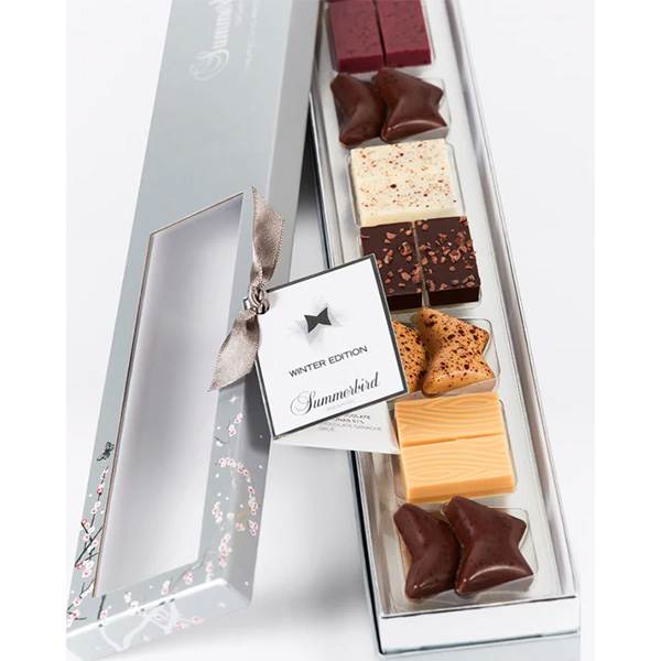 Winter Edition udgør den ideelle ledsager til julebordets delikatesser, som værtindegave til en af julens mange fester eller hvis du ønsker at forkæle dig selv. Den elegant æske indeholder et eksklusivt udvalg af nøje udvalgte varianter af Summerbrids ikoniske og elegante miniaturechokolader.