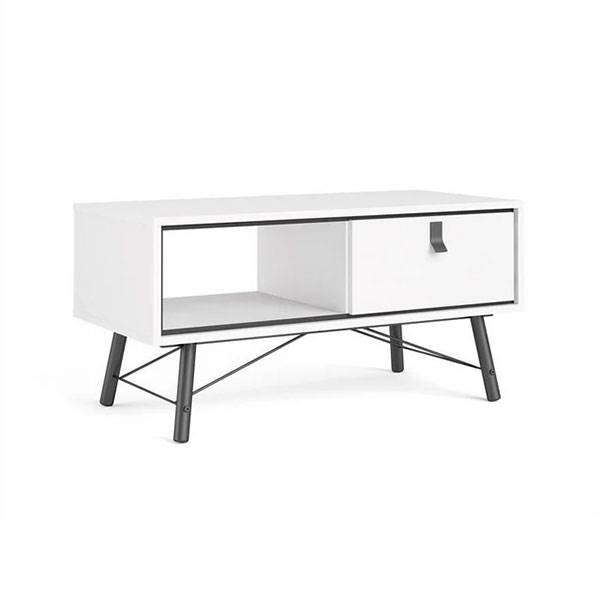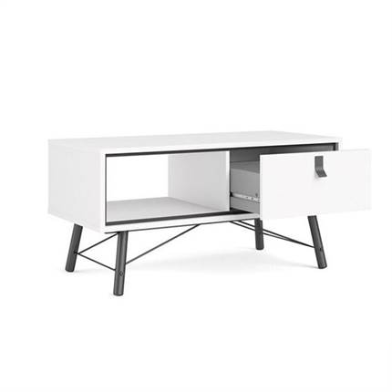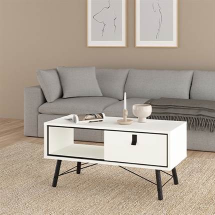 Skab en beroligende atmosfære i dit hjem med det elegante Tvilum Ry sofabord. Sofabordet er designet med en praktisk skuffe og en åben hylde, som giver god plads til opbevaring af bøger, fjernbetjeninger og dekorative genstande. Det sorte metalhåndtag gør det nemt at åbne og lukke skuffen, mens den tofarvede ramme og de vinklede massive træben med metalforbindelser tilfører et moderne og karakterfuldt udtryk.