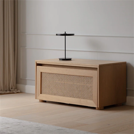Hideaway fås i flere varianter og med tre forskellige låger – grid, oak og venetian cane – så du kan skabe det look, der passer bedst til din stil. Den kan desuden suppleres med hynder og hylder, som gør det endnu lettere at tilpasse funktion og udtryk efter behov. Et smukt og fleksibelt møbel, der løser mange opgaver i hjemmet uden at gå på kompromis med designet.