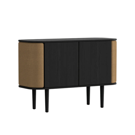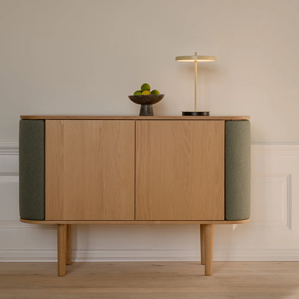 Treasures fås i flere varianter med eg, dark oak eller black oak, og siderne kan tilpasses med fire nøje udvalgte farver i Umages 100% genanvendte Horizons tekstiler, venetian cane eller brun faux-læder. Skabet passer ind i alle hjemmets rum – fra entreen og stuen til kontoret – og giver både et stilfuldt og funktionelt indtryk. Tresuares skænken fås også i en større model (3 dører). Find skænken her.