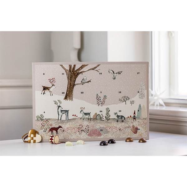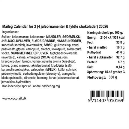 Bag størstedelen af kalenderens låger gemmer der sig eksklusive, klassiske chokolader fra Xocolatl – skabt til at forkæle både store og små ganer. Som en særlig gestus indeholder de fire adventslåger hver et elegant, håndlavet ophæng fra Maileg. Disse fine figurer kan hænges op, samles og bringe glæde år efter år – og dermed blive en del af din faste juletradition.